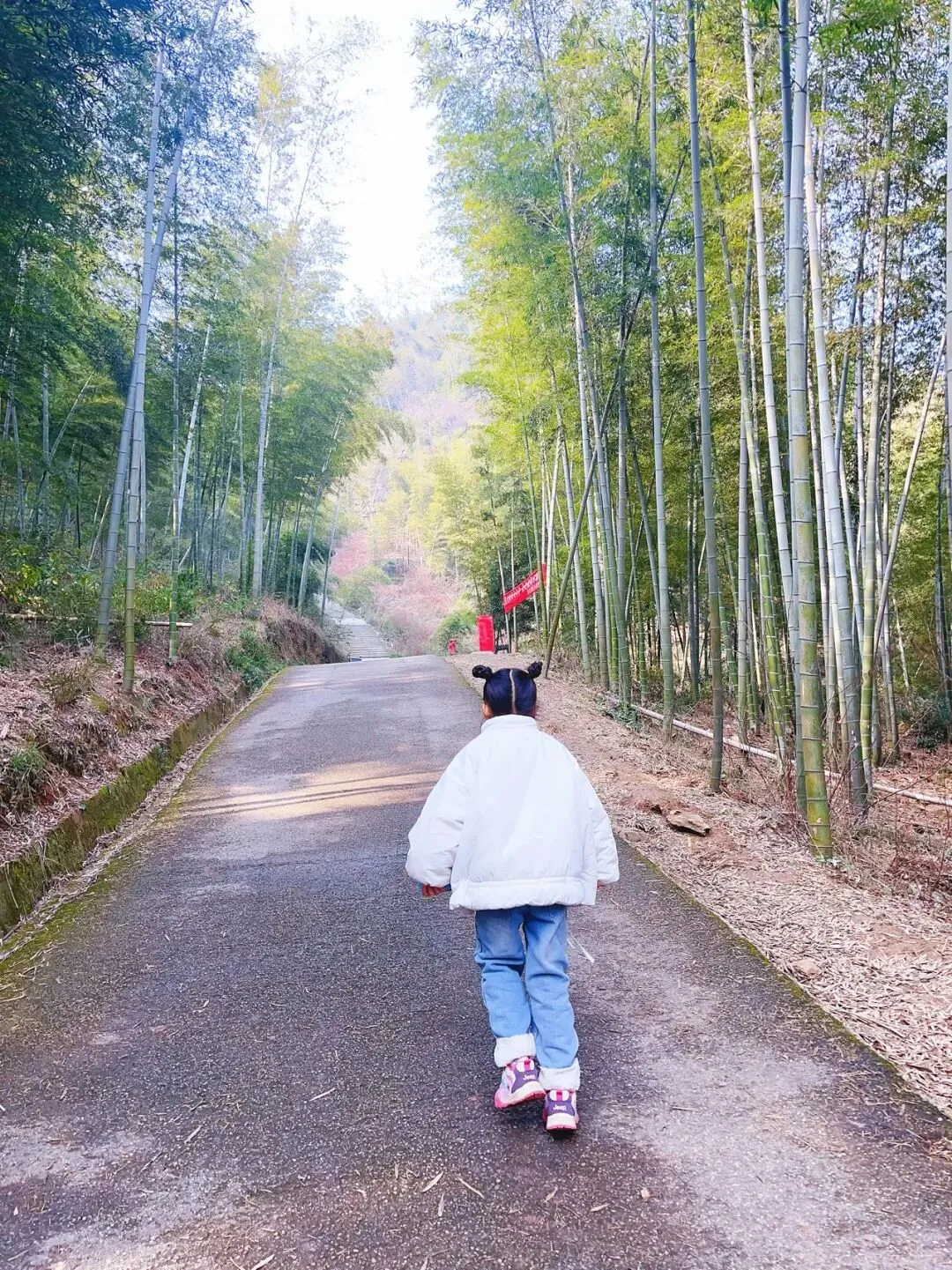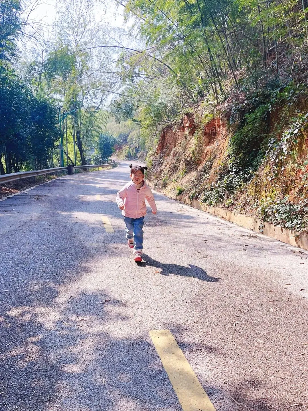 下山的路,我们没有原路返回。而是顺着山脊线前行,这一段路是山路,不难走,最后一段有一个约20m小陡坡,需要注意脚下。穿过竹林台阶,向下就到了半山腰的水泥路。此时阳光明媚,光影斑驳,孩子玩兴大发,以前我们只走这条半山腰的水泥路,单纯欣赏这无尽的竹林也是一种极致的享受。