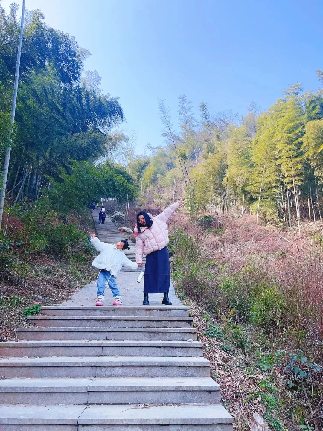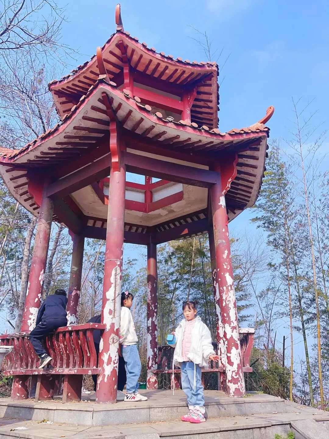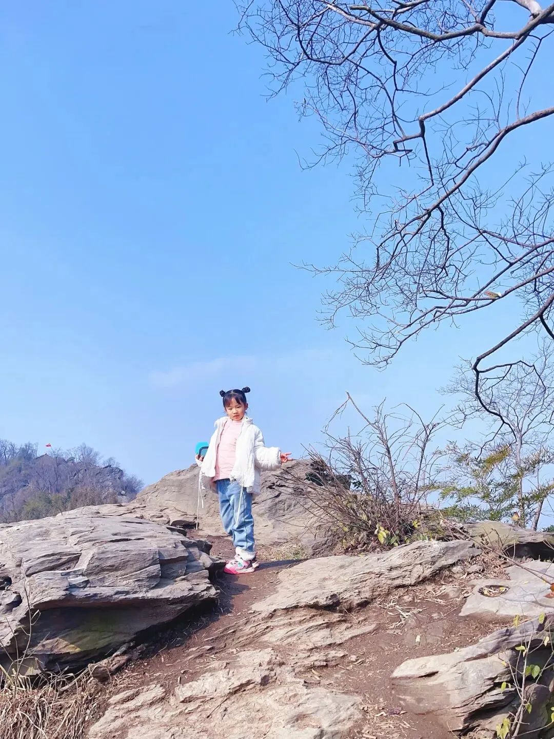 路上偶遇了特别多的小朋友,特别可爱,你追我赶一会儿就达到山顶亭台了。竹林环绕,挡住了来风,很多徒步登山爱好者在此处歇息。沿着亭子左侧,顺着山脊线走几分钟,到达怪石嶙峋处拍照打卡。今日目标完成✔️