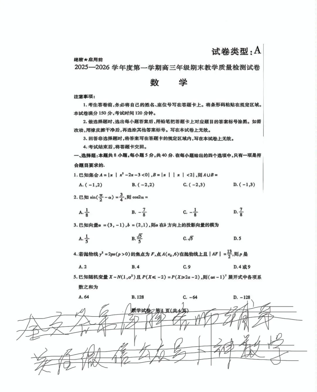 云南普洱市2025-2026学年高三上学期期末教学质量监测数学试题