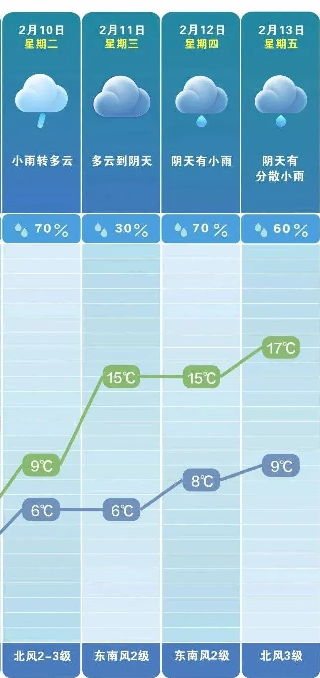 其中,10日小雨转多云,气温小幅回升到6℃至9℃;11日是本周难得的“雨水中场休息日”,多云转阴天,气温大幅跃升至15℃,但最低温仍维持在6℃,昼夜温差显著,需注意及时增减衣物;12日到13日小雨再度“返场”,但最高气温将升至17℃,最低气温也稳定在8℃至9℃,湿冷感被暖意冲淡,多了几分温润。