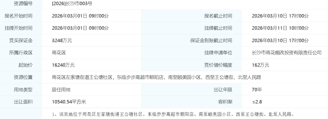 今日(2月9日)上午,长沙土地市场挂牌了今年首宗宅地。该地块编号为[2026]长沙市003号,位于雨花区左家塘街道王公塘社区,东临步步高超市朝阳店、南至颐美园小区、西至王公塘街、北至人民路,该宗地即市场备受关注的王公塘地块。该地块在去年11月进行了商改住调规公示,将Z13-B48、Z13-B51地块及Z13-B49地块部分用地合并成Z13-B48地块,用地性质调整为居住用地,净用地面积10588平方米,容积率≤2.8,建筑密度<22%,绿地率>35%,建筑控高80米;