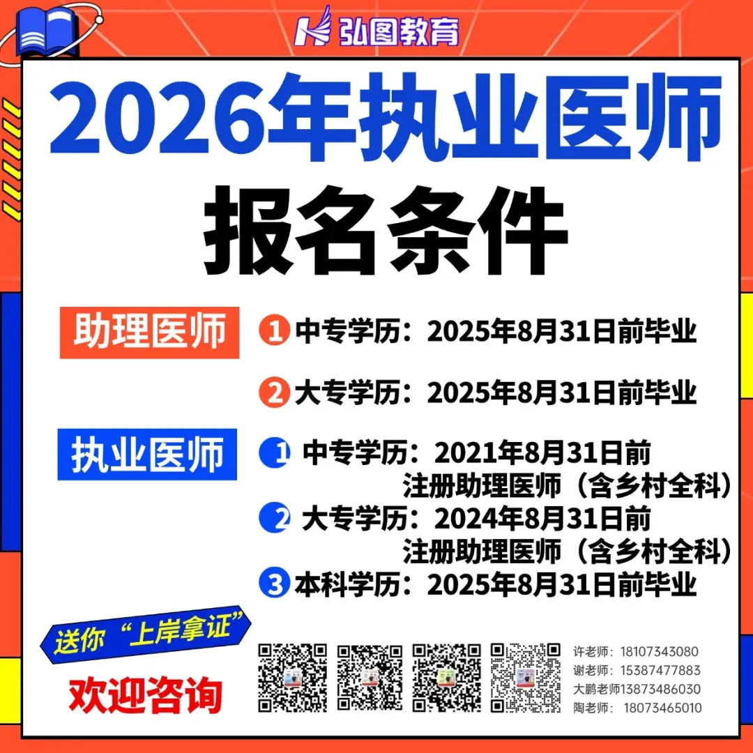 2.具有高等学校医学专科学历,取得执业助理医师执业证书后,在医疗、预防、保健机构工作满两年,且助理医师证从注册之日至2026年8月31日满2年;具有中等专业学校医学专业学历,取得执业助理医师执业证书后,在医疗、预防、保健机构中工作满五年,且助理医师证从注册之日至2026年8月31日满5年,均可参加执业医师资格考试。