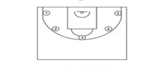考试方法:如图1所示,在以篮圈中心投影点为圆心,5.5米为半径所划的弧线上设置五个投篮点(球场两侧0度角处、两侧45度处和正面弧顶),每个点位放置5个球,共25个球。考生须从第1投篮点或第5投篮点开始投篮,按逆时针或顺时针方向依次投完每个点位的5个球。测试时间为90秒。要求考生必须在弧线外投篮,球出手前双脚不得踩线,若踩线投中则计为无效投篮,不得分。也可以选择全部投三分,以三分线为界,其他方法同上。每人可测试2次,取最好成绩。