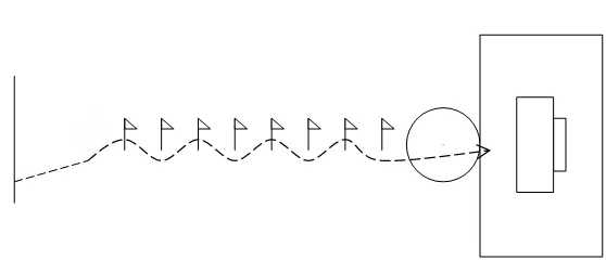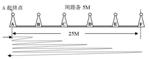 测试方法:如图3考生从起跑线向场内垂直方向快跑,在跑动中依次用手击倒位于5米、10米、15米、20米和25米各处的标志物后返回起跑线,要求每击倒一个标志物须立即返回一次,再跑到下一个标志物,以此类推。考生应以站立式起跑,脚动开表,完成所有折返距离回到起跑线时停表,记录完成的时间。未击倒标志物,成绩无效。每人测试2次,取成绩较好的一次为评分标准。