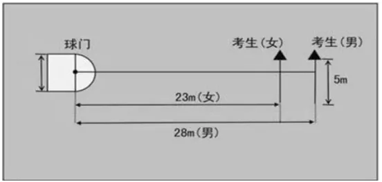 测试方法:如图4所示,传球标区域由一个七人制足球门(球门净宽度5米,净高度2米)和以球门线为直径(5米)画的半圆组成,圆心(球门线中心点)至起点线垂直距离为男子28米。考生须将球置于起点线上(线长5米,宽0.1米)向目标区域连续传球6次,左右脚均可,脚法不限。