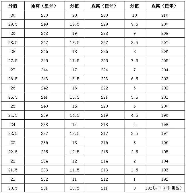 b素质、基本技能平分标准:立定跳远评分标准如表8,掷远与踢远评分标准如表9,扑接球频分标准如表10 。