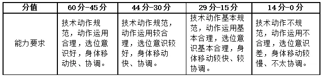 评分标准:如表7,重点考察考生的技术运用能力和比赛意识。