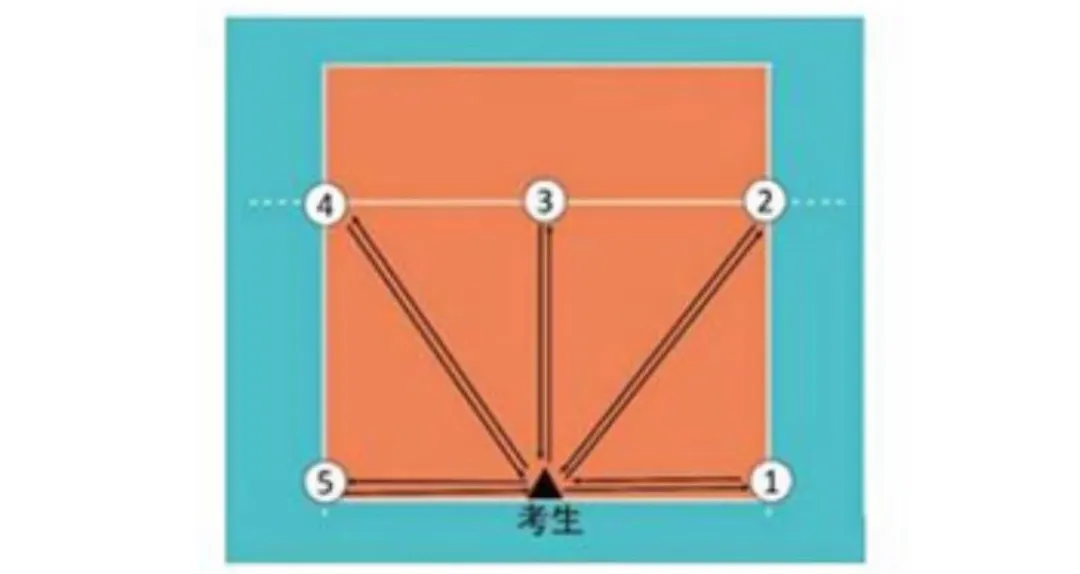 考试方法:考生面向球网,从起点(端线中点)起动,计时开始,先向1号点移动,击倒1号点标志物后,应立即返回起点并击倒起点处标志物,再向2号点移动,以此类推,直到击倒5号点标志物回到端线中点(须将每个标志物击倒,否则不计成绩),计时停止,记录完成的时间。每人测试2次,取最好成绩。如图6所示。