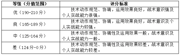 评分标准:考评员参照实战能力评分细则(表14),独立对考生的技术动作规范、协调程度,运用效果,战术意识以及个人实战能力等方面进行综合评定。采用210分制评分,分数至多可到小数点后1位。