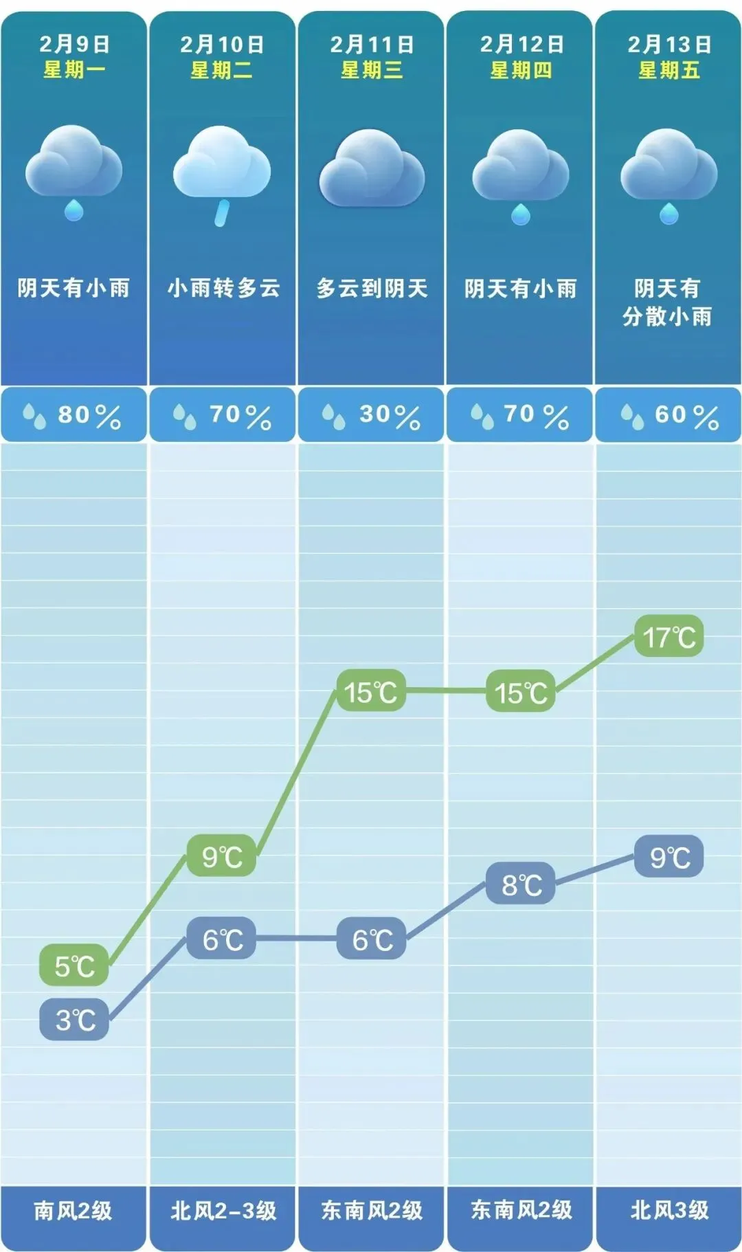 今天,阴天有小雨,气温3 ~5℃。