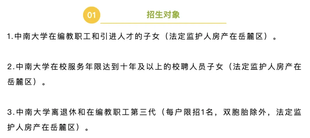 * 招生范围:主要为中南大学在编教职工和引进人才的子女、校聘人员子女以及离退休和在编教职工的第三代。