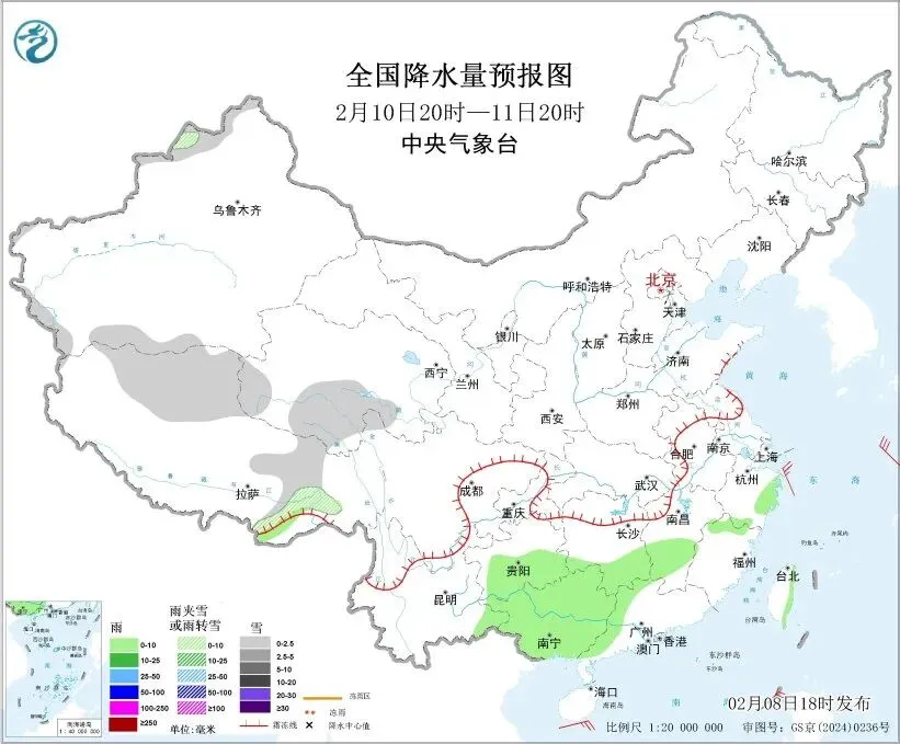 2月8日至10日,西藏东南部、西南地区东部、江汉、江淮、江南、华南西部和北部等地有小雨,其中,湖北西部、湖南北部等地将出现雨转雪或雨夹雪;新疆北疆、西藏东部、川西高原、甘肃南部、陕西南部、山西南部、山东等地部分地区有小雪或雨夹雪,局地有中雪。