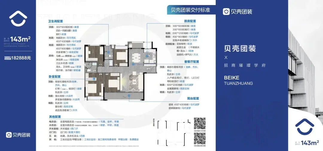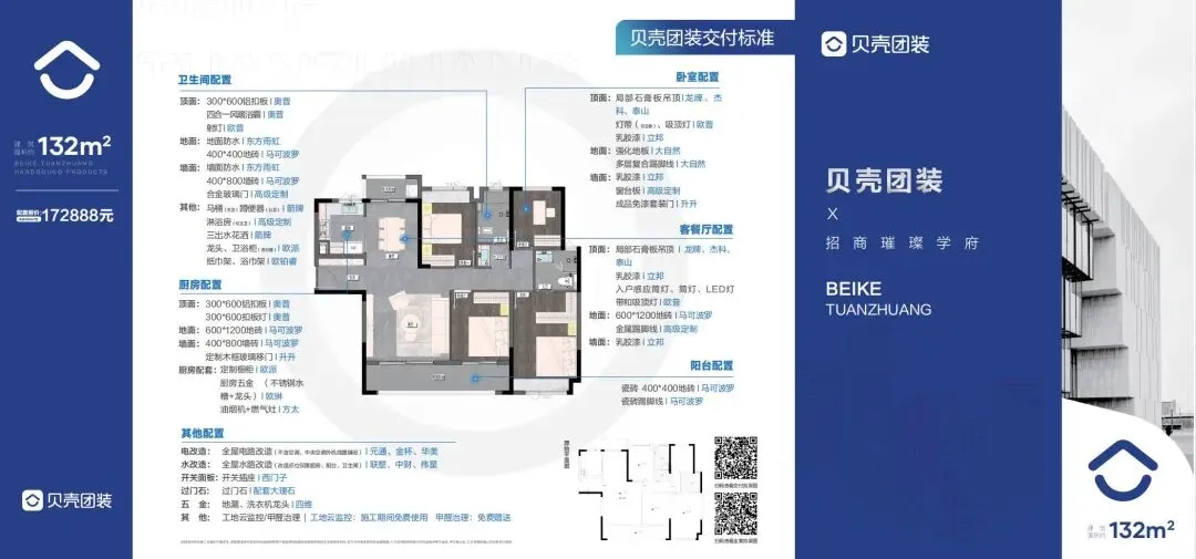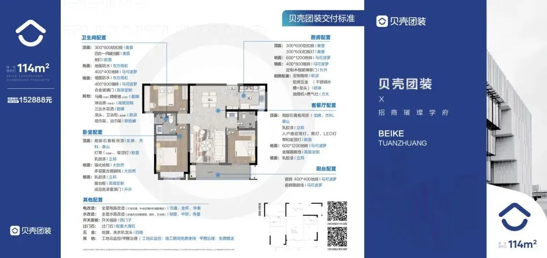 除了硬核的外部配套,璀璨学府的产品本身,也充满了诚意。项目在售114/132/143平三大户型,毛坯交付,更有贝壳专属团装优惠,114平团装总价仅152888元,132平172888元,143平182888元,省时、省力、省心、省钱,轻松实现精装入住。