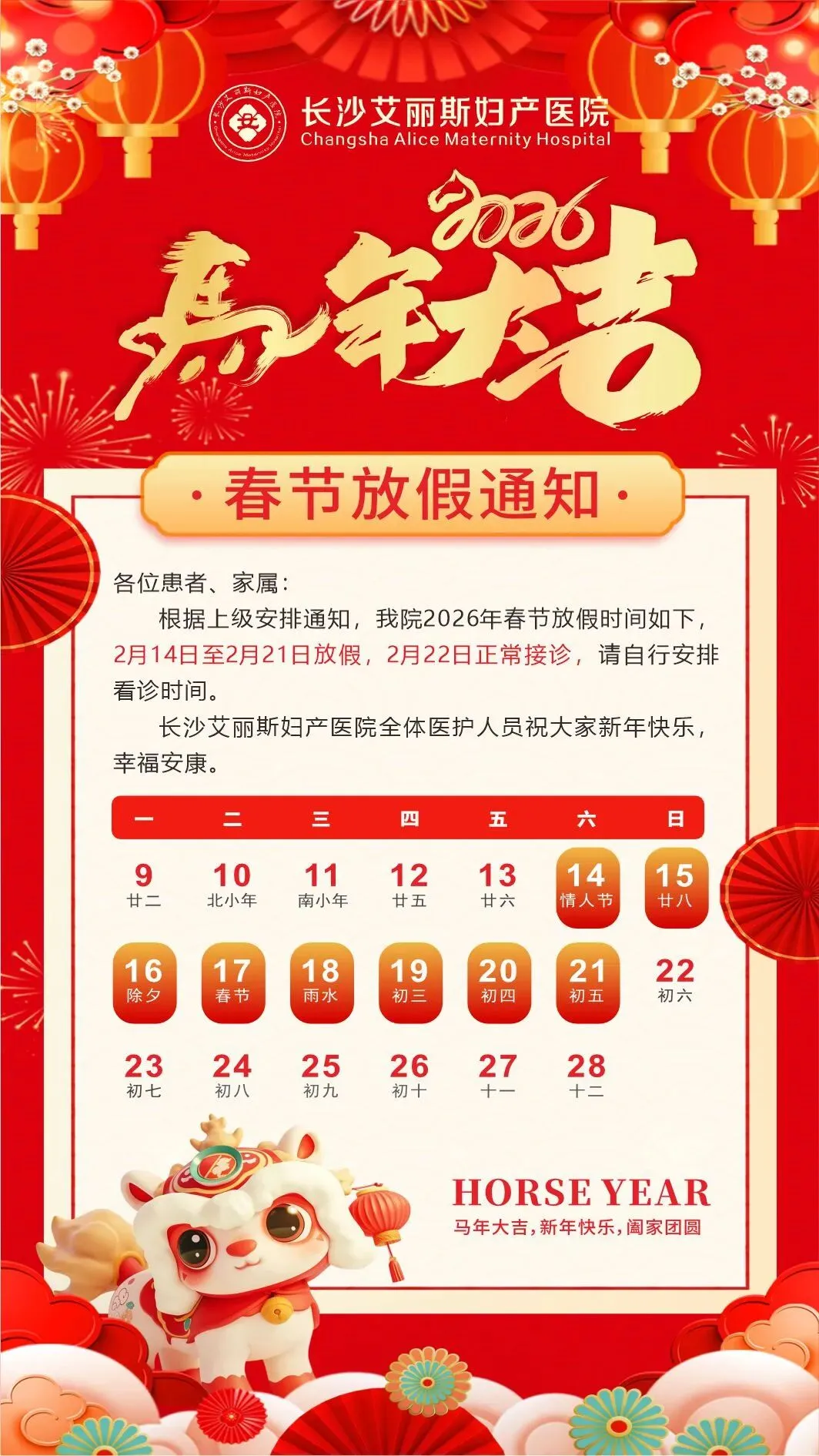 长沙艾丽斯妇产医院2026年春节放假通知