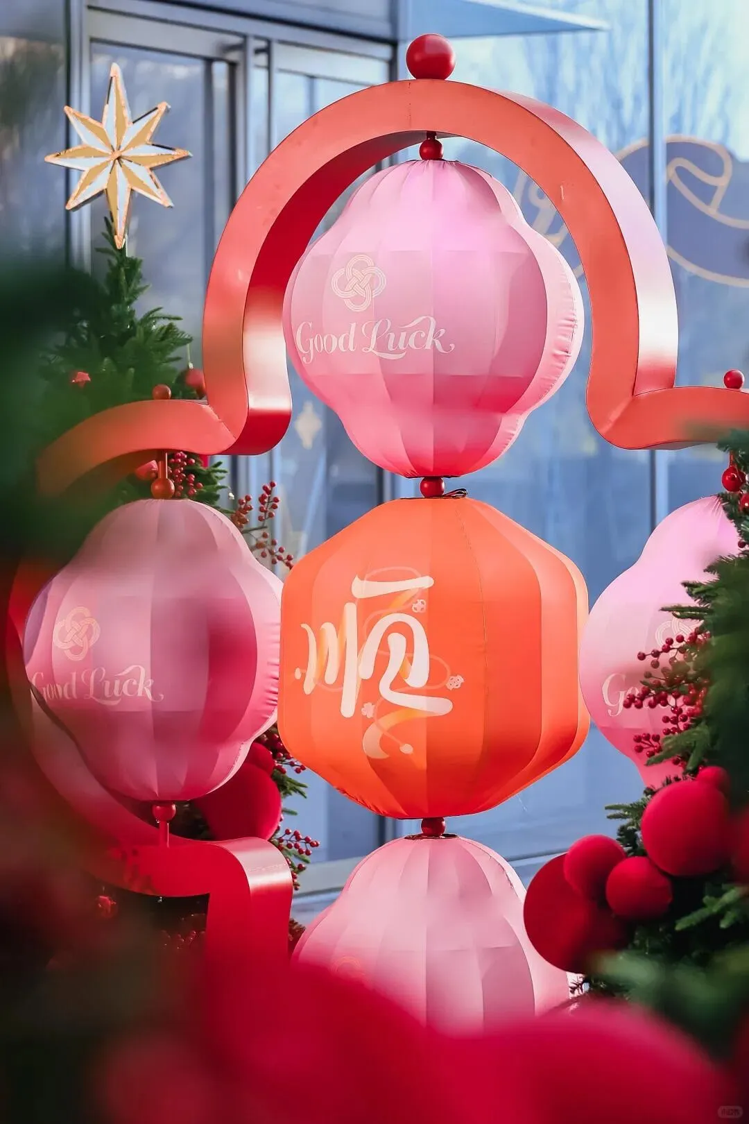 今年,长沙万象城在户外广场布置了一整面红灯笼墙,中间一个巨大的霓虹“顺”字,简直是“为出片而生”。穿上红毛衣、棕外套,或是试试新中式穿搭,往灯笼前一站,怎么拍都很有新春氛围感。