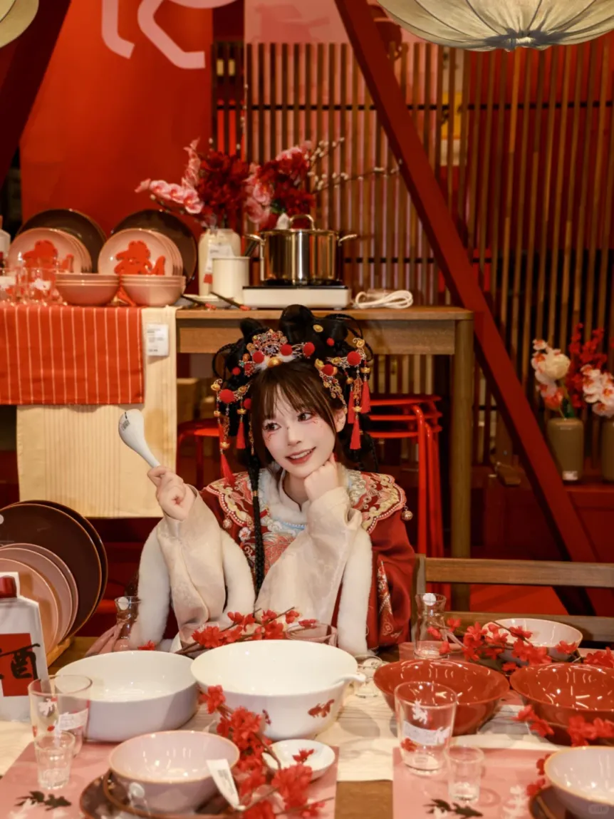 布景也超级出片——红绸挂满屋檐,灯笼串成走廊,随手一拍都好看。