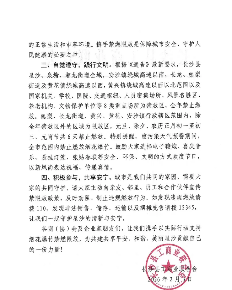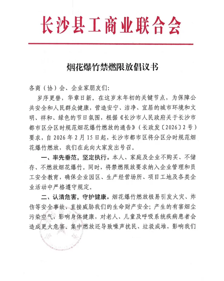 长沙县工商联 烟花爆竹禁燃限放倡议书 @全体会员单位,请查收!