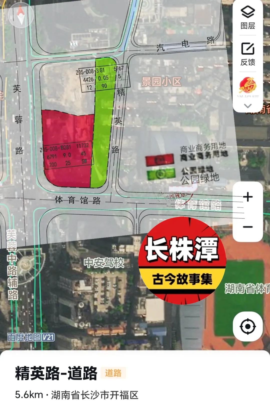 长沙开福区为了提升湖南省体育场周边环境,将在芙蓉路东侧,体育馆路北侧,精英路西侧,汽电路南侧规划建设一处大公园,下图中的绿色部分是公园绿地,红色部分是商业商务用地。