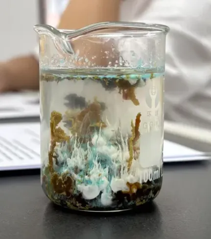 学生化身“园丁”,自主向溶液中添加不同离子,亲手打造专属的“水下花园”。为了让花园更绚丽,他们主动记忆、对比不同离子对应的颜色,在沉浸式创作中深化了知识理解。更重要的是,实验还模拟了晶体在水溶液中的生长过程,我们以此为延伸,衔接材料科学中晶体生长的实际应用,让学生的视野从实验室跨越到真实工程领域,读懂化学与生活、科技的紧密关联。