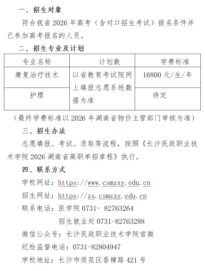 长沙民政职业技术学院是国家第一期、第二期“双高建设计划”单位,其康复治疗技术专业是中国特色高水平专业群骨干专业、国家示范性重点专业、中国残疾人联合会与教育部职业院校残疾人康复人才培养改革试点专业。