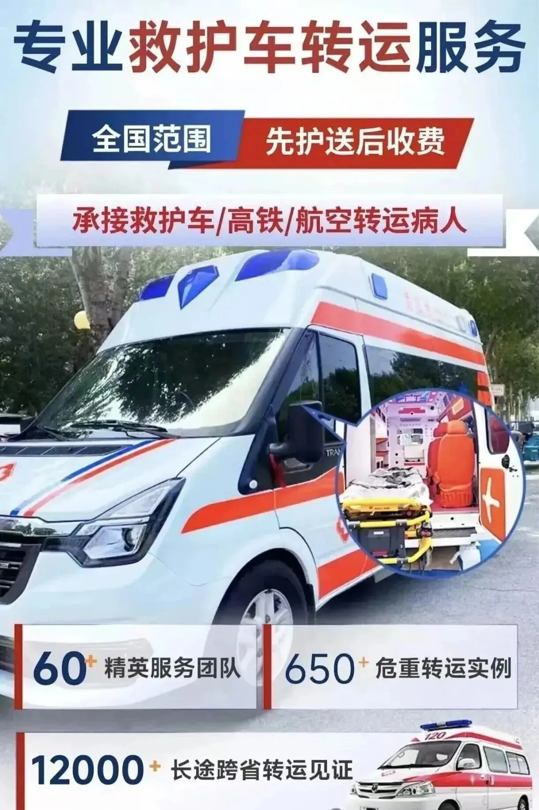我们是120救护车出租转运服务咨询公司,我们的团队是全网最专业的医疗团队,我们的价格也是全网最优惠的价格。我们的主要业务就是,长途跨省,出院转院,120接送病人,救护车护送服务,飞机高铁转运病人。如果您现在需要用救护车,可以直接找我们客服进行预约。