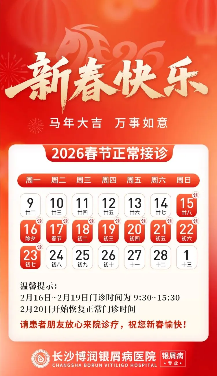 为保障大家节日期间的就诊需求,长沙博润银屑病医院春节期间门诊正常接诊,各治疗项目正常开展,详细情况如下: