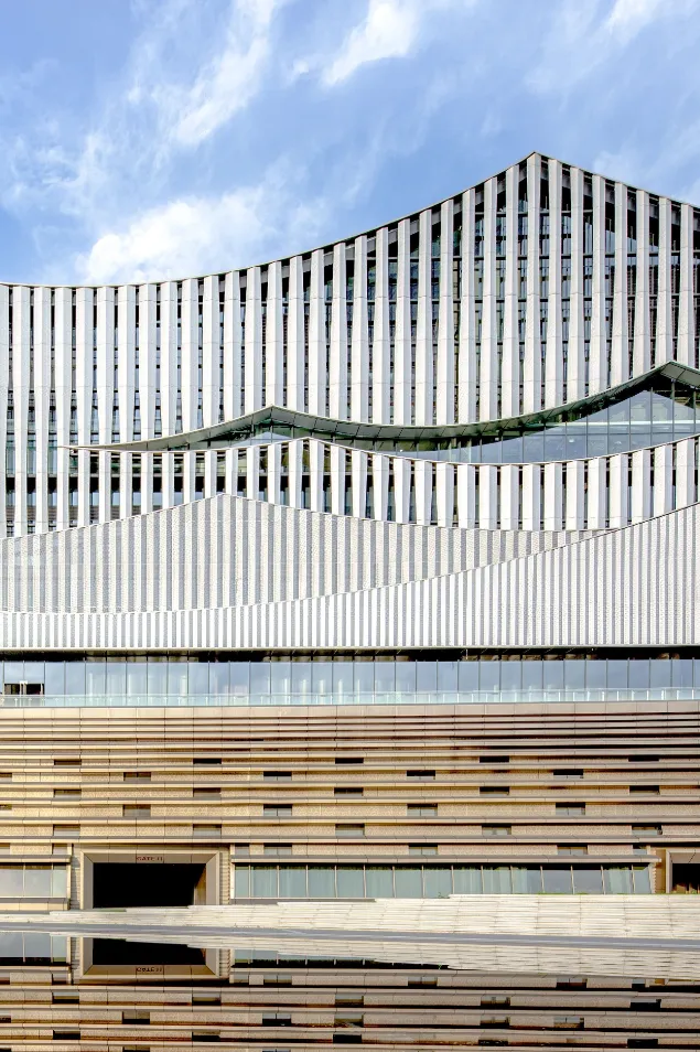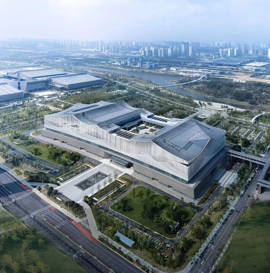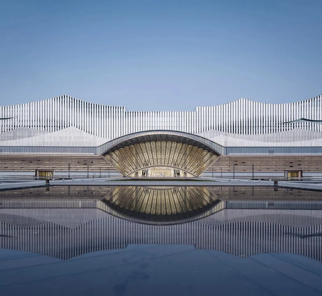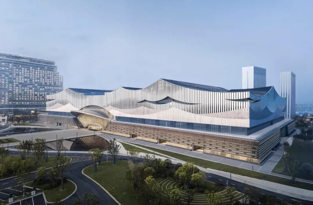 何镜堂老院士真的很高产,落地的作品是真的多!今天再给大家介绍一个长沙的地标建筑,那就是长沙国际会议中心。项目位于长沙市高铁会展新城会议会展片区,在浏阳河东边。这个建筑是中国中部地区规模最大的会议综合体项目在2020 年 10 月 30 日正式启用,总投资约 26 亿元,规划总用地面积约 21.27 万平方米,总建筑面积约 17 万平方米,建筑高度 46.8 米,整体建筑分为地上三层、地下一层。建筑由中国工程院院士何镜堂领衔的华南理工大学建筑设计研究院何镜堂院士工作室完成!长沙国际会议中心规模挺大的,一楼有 6 个多功能厅以及媒体发布厅、会展厅,二楼拥有华中地区面积最大的 7800 平方米主会场,可容纳 7000 人同时参会,还有 3400 平方米的湘江厅,三楼则设置了圆桌会议厅和 5800 平方米的户外屋顶花园,这里是中非经贸博览会的永久主会场长沙国际会议中心有着很浓厚的湖湘地域特色,建筑起伏的屋顶像岳麓群山,屋顶的设计也加入了中国传统建筑坡屋顶的造型意象。建筑的西门主入口以羽扇为设计原型,设计了 81 米的扇形弧面,这个双曲线结构的入口像一轮明月这个项目的立面设计可是一绝!由外层的条形铝板和内层的玻璃幕墙构成,其中外层有 7438 块长短不一、宽窄不同的条形铝板拼接而成,每一块铝板都像中国古代的简牍,这些铝板通过参数化设计组合成一幅 300 米长的立面画卷,疏密变化的线条让建筑立面有了丰富的层次。内层的玻璃幕墙由 4550 片大小不等的玻璃组成,最大的单片玻璃高 5.5 米、宽 1.55 米,重约 200 公斤,整个建筑立面看起来就像虚实相生的中国山水画。你觉得何镜堂在长沙的这一巨作设计的如何呢?欢迎留言评论区!