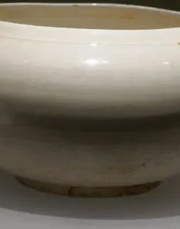 这件瓷洗采用定窑典型的轮制工艺,轮制痕迹清晰可见,口部饰一周凸出弦纹,内壁施釉及底,外壁施釉不及底,有明显的流釉现象——这正是晚唐定窑的典型工艺特征,此时的定窑尚未完全成熟,施釉工艺不够均匀,偶尔会出现流釉、口沿变形的情况(这件瓷洗口沿就有轻微变形),反而成为了“真品标识”。