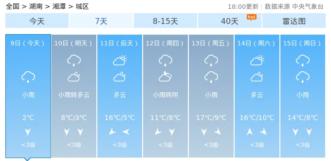 9日(今天):小雨,气温:2℃10日(明天):小雨转多云,气温:8℃/3℃11日(后天):多云,气温:16℃/5℃12日(周四):小雨转阴,气温:11℃/8℃13日(周五):小雨,气温:17℃/9℃14日(周六):多云,气温:16℃/10℃15日(周日):小雨,气温:14℃/8℃