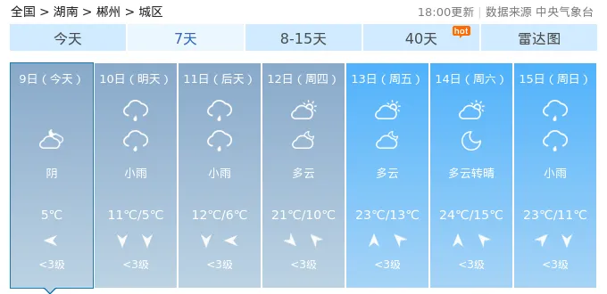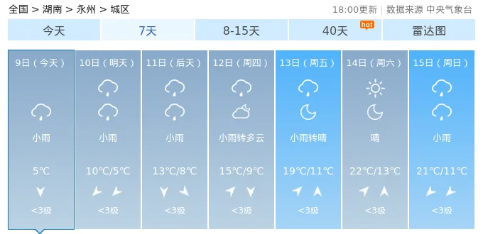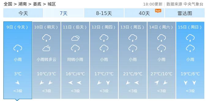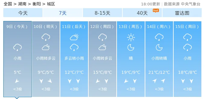 9日(今天):小雨,气温:4℃10日(明天):小雨转晴,气温:9℃/4℃11日(后天):多云转小雨,气温:13℃/7℃12日(周四):小雨转多云,气温:14℃/9℃13日(周五):小雨转多云,气温:18℃/10℃14日(周六):小雨转多云,气温:22℃/11℃15日(周日):小雨,气温:18℃/8℃
