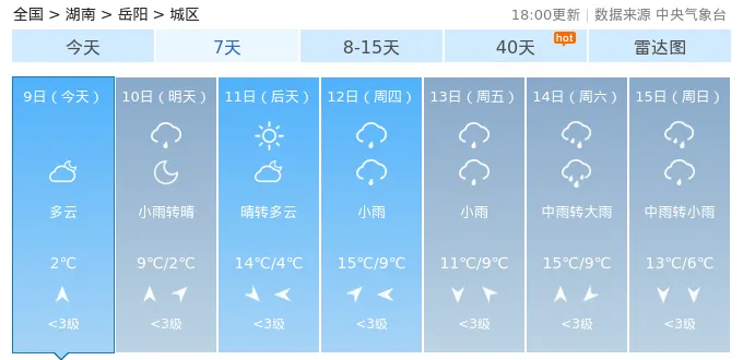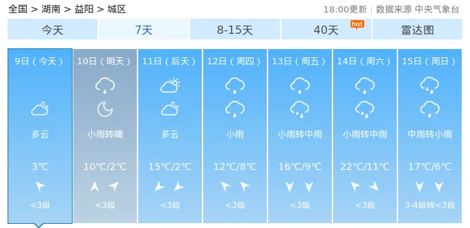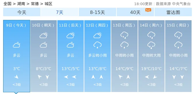 9日(今天):多云,气温:3℃10日(明天):多云,气温:8℃/3℃11日(后天):多云,气温:13℃/5℃12日(周四):多云转小雨,气温:13℃/8℃13日(周五):中雨转小雨,气温:14℃/9℃14日(周六):中雨转大雨,气温:19℃/10℃15日(周日):中雨转小雨,气温:14℃/7℃