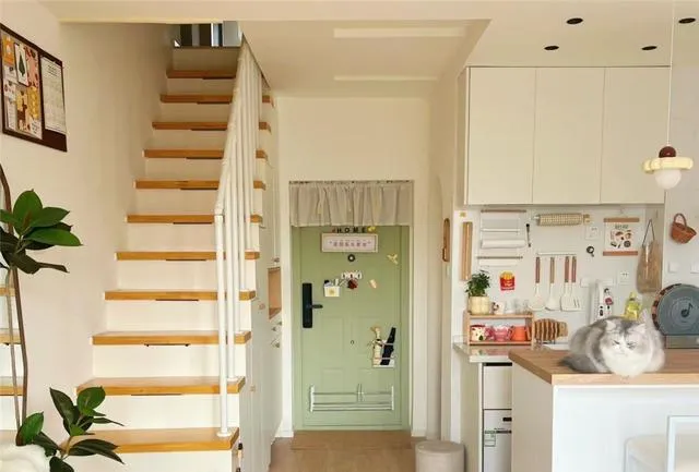 住小户型最怕收纳不够,可人家直接把5米层高玩出了花!一整套楼梯设计连通上下两层,楼梯底下全是大柜子,杂物再多都不怕。她家连猫窝都挤在楼梯角落里,猫主子有独立领地,两全其美!