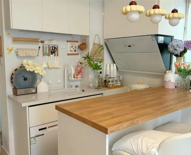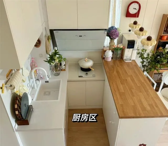 往里走两步,就是她家的开放式厨房了,吧台隔断的设计瞬间提升空间层次感。灶台、洗菜池、吧台台面组成U型布局,煮饭、备菜、下厨一气呵成,空间虽小还能腾出手来喝杯奶茶。
