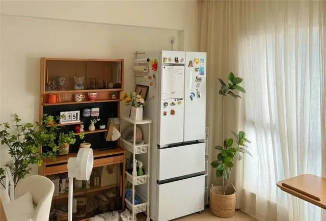客厅正对面原本放电视的位置,现在成了“餐边柜+法式门冰箱”组合。吃饭、收纳、做饭一举多得,早上喝咖啡、偶尔小聚轻轻松松。朋友来家里都说她家像日剧女主角的温馨小窝,羡慕得直跺脚!