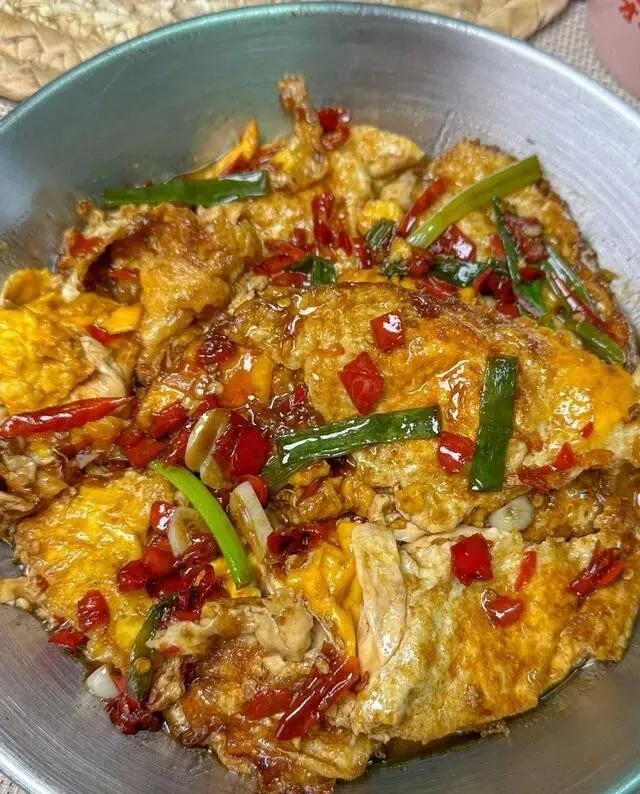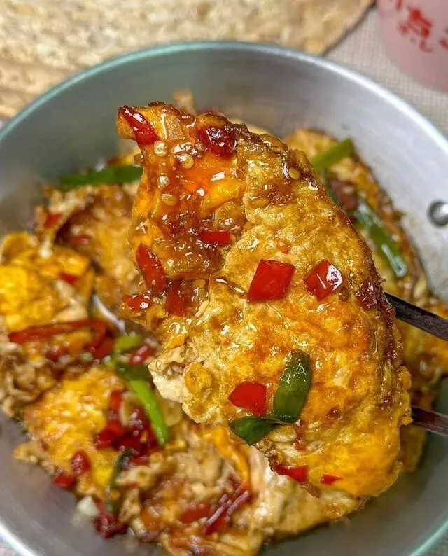 焦香的蛋块裹满酱汁 , 入口先是一股霸道的鲜辣 , 紧接着 , 醋的酸爽就窜上来了 , 又香又辣又开胃!