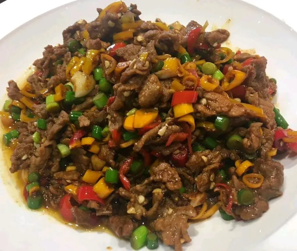 老长沙味牛肉是我当天很喜欢的一道。红黄辣椒切小丁,再配上蒜苗段,颜色看着就很有食欲。牛肉炒得特别嫩,完全不柴,每一口都吸足了香辣汤汁,很下饭,我们一家人都吃得停不下筷子。