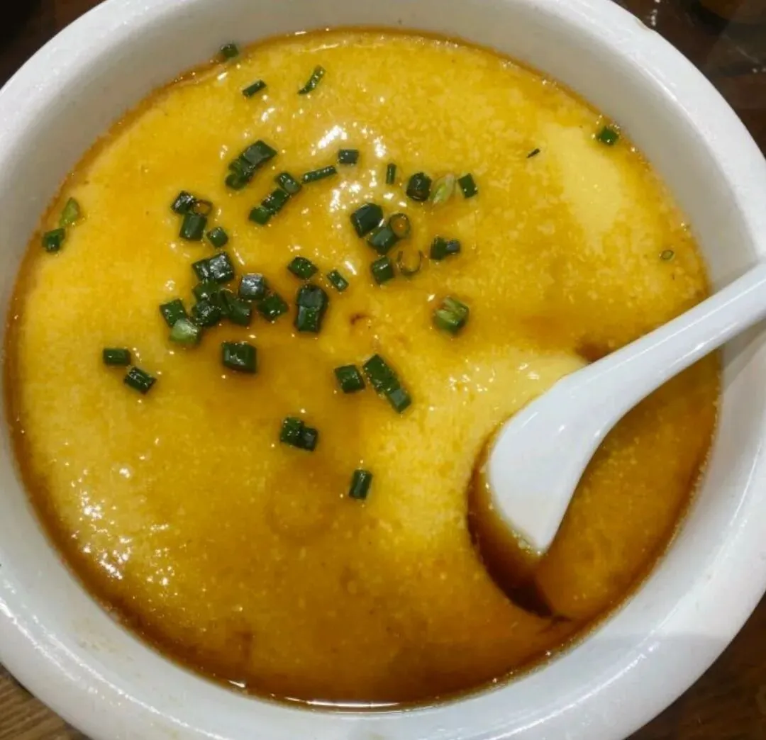 还有我每次下馆子几乎必点的蒸蛋,这家做得真的绝。端上来DuangDuang的,像布丁一样嫩,挖一勺入口,滑溜溜的,鲜而不腥,简单却最治愈,我一个人就能吃掉小半碗。