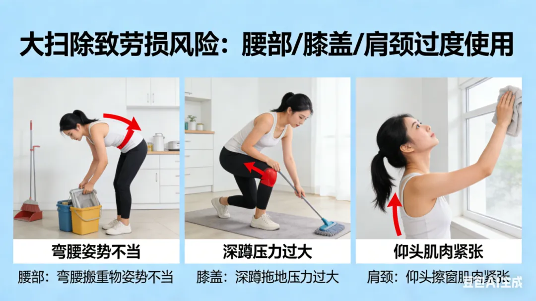 大扫除、搬年货、长途乘车……这些节前常见活动,容易导致腰部、膝盖、肩颈等部位过度使用或姿势不当,诱发劳损。