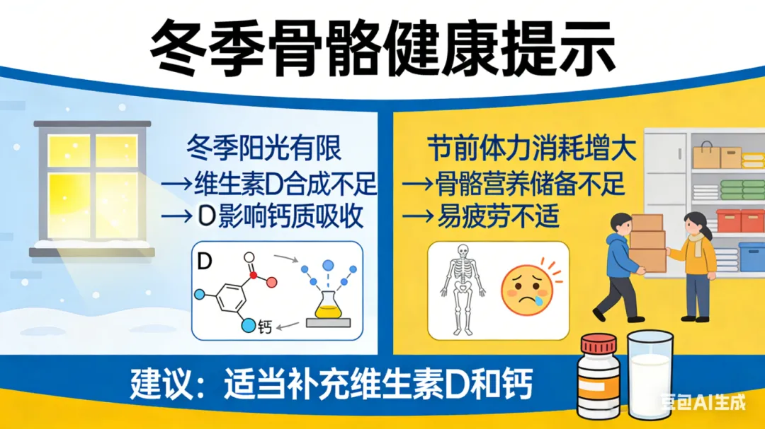 冬季阳光依然有限,维生素D合成不足,影响钙质吸收,而节前体力消耗增大,骨骼营养若储备不足,更易感到疲劳与不适。