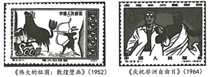 【详解】根据材料及所学可知,第一张邮票《伟大的祖国:敦煌壁画》(1952年):通过展现敦煌壁画,弘扬民族文化遗产,同时也传递了新中国对历史文化的珍视与自信,这是一种新的文化价值观。 第二张邮票《庆祝非洲自由日》(1964年):体现了中国支持非洲民族解放运动、倡导国际平等与反殖民主义的立场,这是一种新的国际政治价值观。两张邮票都通过视觉符号,向公众传递了与旧时代不同的新的价值观念,包括文化自信和国际主义精神,D项正确;仅第一张邮票(敦煌壁画)符合“历史文化遗产”主题,第二张邮票聚焦“非洲独立运动”,与“文化遗产”无关,排除A项;两张邮票均未涉及“经济交流”,第一张是文化宣传,第二张是政治支持,排除B项;第一张邮票体现文化遗产,第二张体现非洲民族独立(人民主权),但“人民当家作主”并非两者共同主题,排除C项。故选D项。