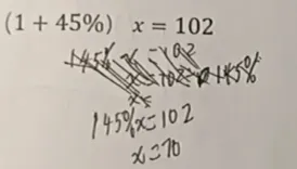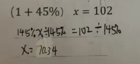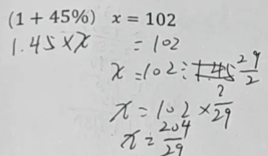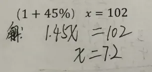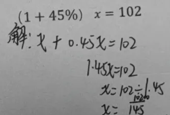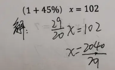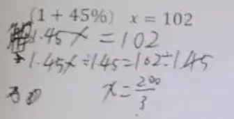 由于真题是我一个一个手动敲上去的,忘记改一个数字,原题应该是左边的,比较简单。实际做的时候,学生打印出来做的是右边的题目。两个题目类型应该是完全一样,只是最后有计算的较大差别。学生做的题,整数除以小数,无法除尽,需要用分数来表示最后的结果。我们来看看学生是如何处理的。
