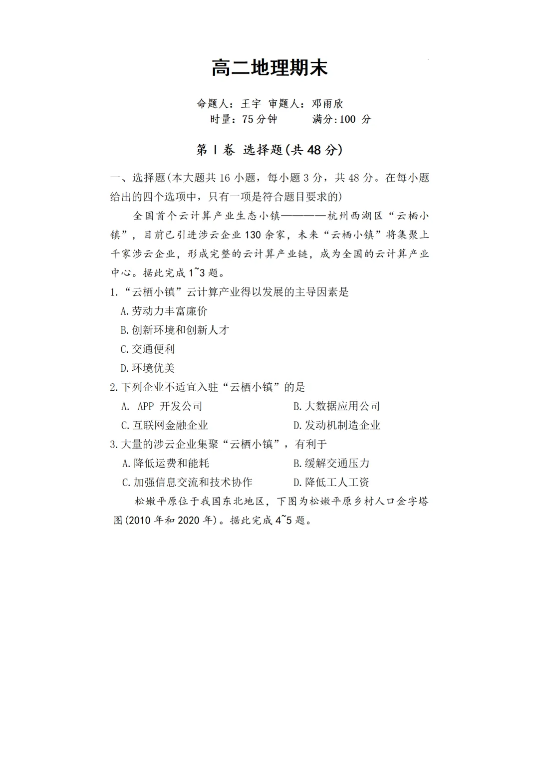 1. B 【解析】云计算属于技术密集型产业,对技术和人才的要求高,创新环境和创新人才是“云栖小镇”云计算产业得以发展的主导因素,相比创新环境和创新人才,交通和环境对其影响较小,B正确,C、D错误;高新技术产业对廉价劳动力需求低,A错误。故选B。