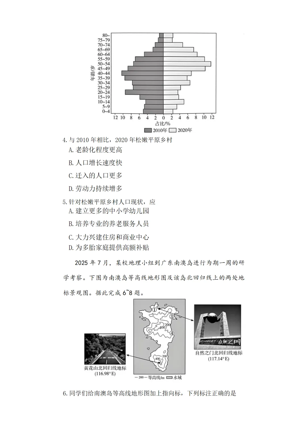 4. A 【解析】从图中可以看出,与2010年相比,2020年老年人口的占比明显更大,说明老龄化程度更高,A正确;45岁以下人口占比下降(除10~14岁),说明人口增长速度减慢,青壮年人口占比下降,说明迁出人口相对较多,劳动力不会持续增多,排除B、C、D。故选 A。
