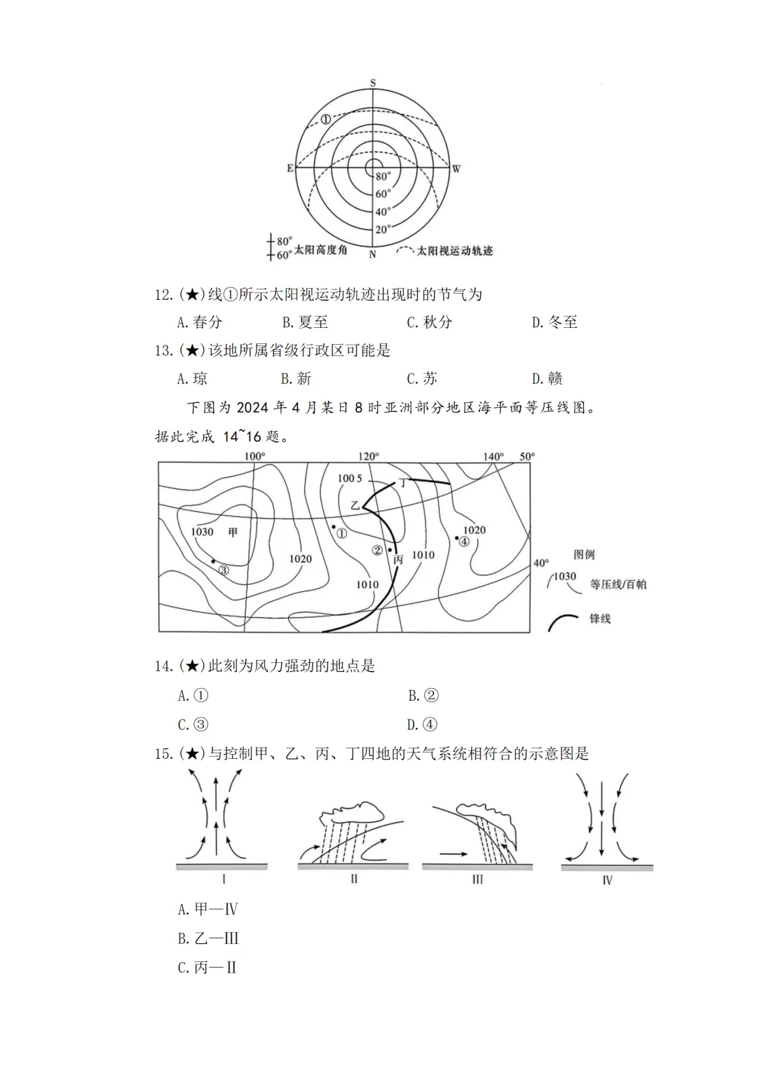 15. A【解析】根据图示可知,甲处为高压中心,盛行下沉气流,对应Ⅳ图,A正确;乙处为低压中心,盛行上升气流,对应Ⅰ,B错误;丙、丁分别为锋面气旋的两个锋面,由于该地区位于北半球,锋面气旋的旋转方向为逆时针,根据锋面气旋“左冷右暖”可以判断丙处为冷锋,丁处为暖锋,丙受来自高纬度冷空气影响,形成冷锋,对应图Ⅲ,C错误;丁处受来自低纬度的暖气团影响,形成暖锋,对应图Ⅱ,D错误。故选A。