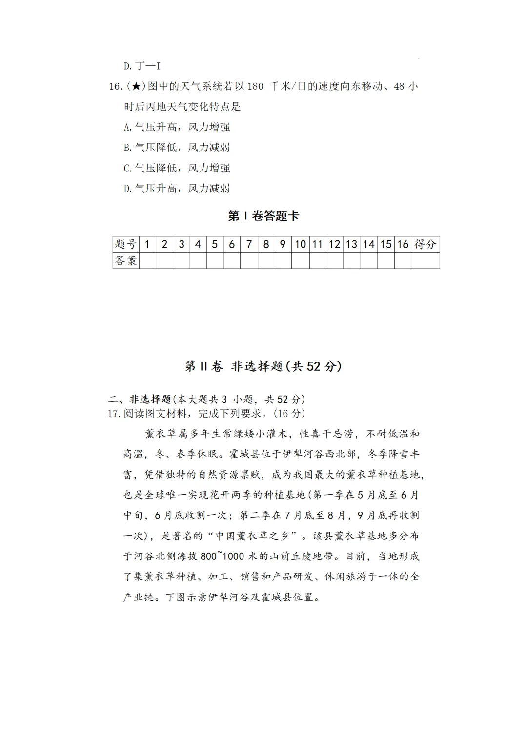 16. A【解析】根据上题分析可知,丙地此时正在经历冷锋过境,48小时后,丙地受冷气团控制,气压升高,B、C错误;天气系统以180千米/日的速度东移,丙地等压线变密集,水平气压梯度力变大,风力增强,A正确,D错误。故选 A。