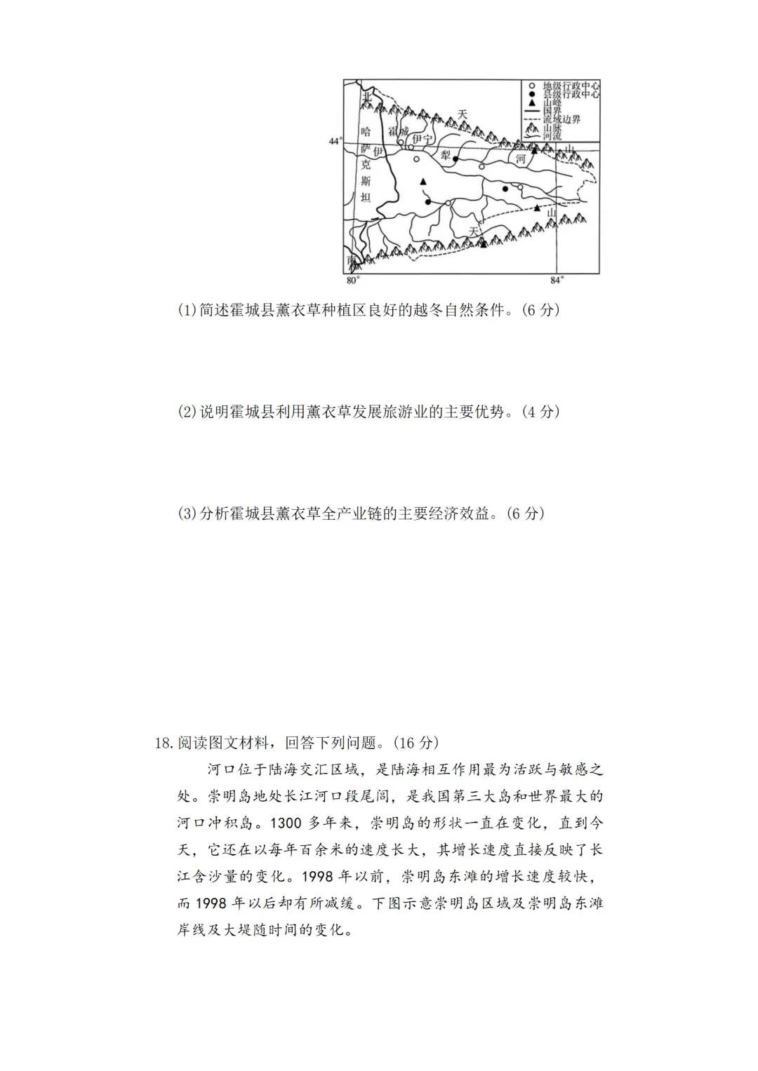 18.(1)长江在流入河口时,地势变低;(2分)海水顶托,长江流速减慢,所挟带的大量泥沙在此堆积;(2分)长年累月逐渐露出水面,形成岛屿。(2分)