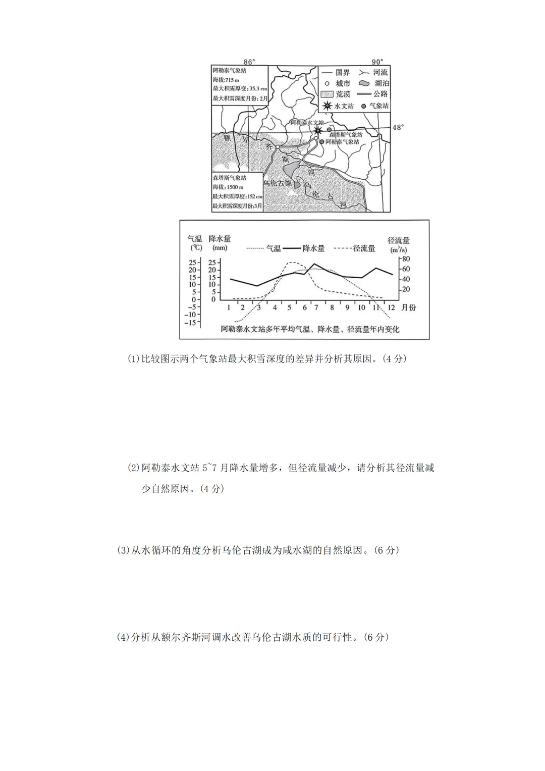 (3)深居内陆,降水稀少;(2分)气候干燥,蒸发旺盛;(2分)乌伦古湖为内流湖,乌伦古河带来盐分在湖中不断积累,形成咸水湖。(2分)