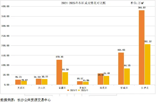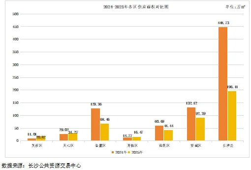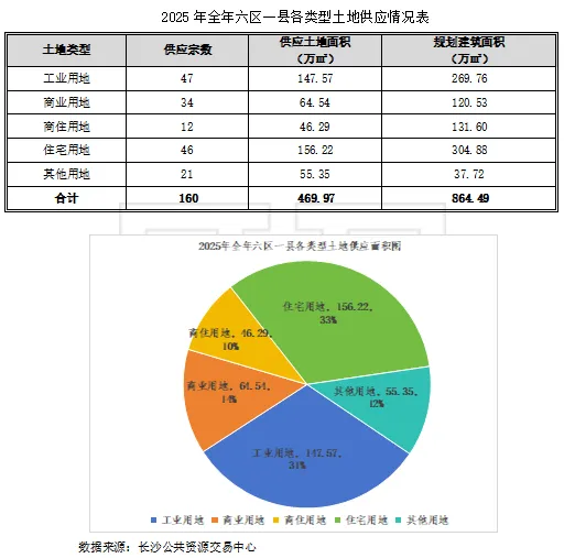 根据长沙公共资源交易中心的数据,2025年长沙市六区一县(注:六区一县指芙蓉区、天心区、开福区、雨花区、岳麓区、望城区及长沙县,下同)土地共供应160宗,供应土地面积约469.97万㎡,同比下降约43%,可建设的建筑面积约864.49万㎡,同比下降约49%。