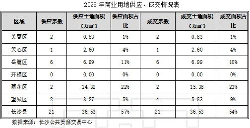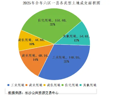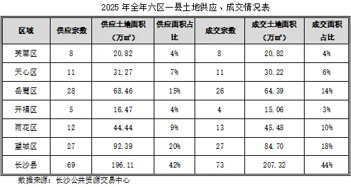 根据长沙市公共资源交易中心的数据,2025年长沙市土地交易主要集中在长沙县、望城区、岳麓区,其中成交、供应长沙县均排行第一,望城区为第二。