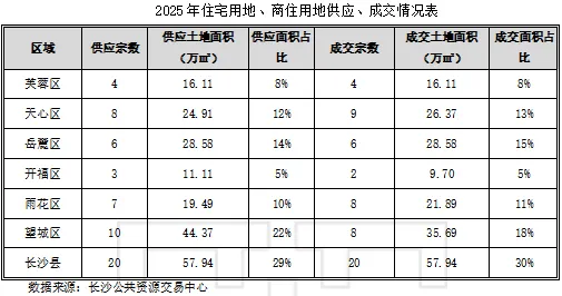 2025年住宅用地、商住用地全年六区一县共供应202.50万㎡,其中长沙县供应土地面积最多,供应土地面积57.94万㎡,占比29%;